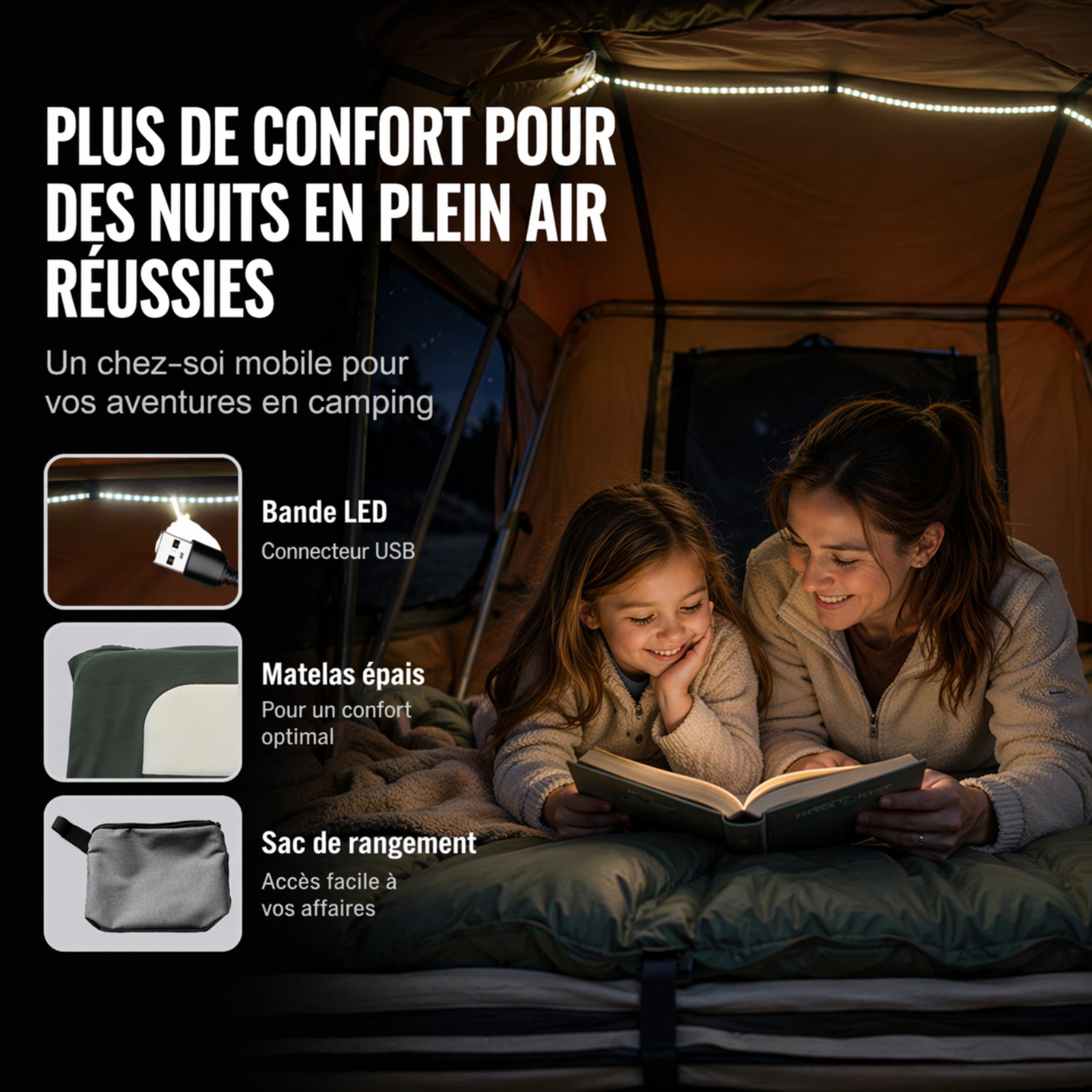Elle s’installe sur le toit du véhicule et propose un intérieur ventilé avec moustiquaires, un matelas intégré, ainsi qu’une bande LED et un sac de rangement pour plus de praticité.