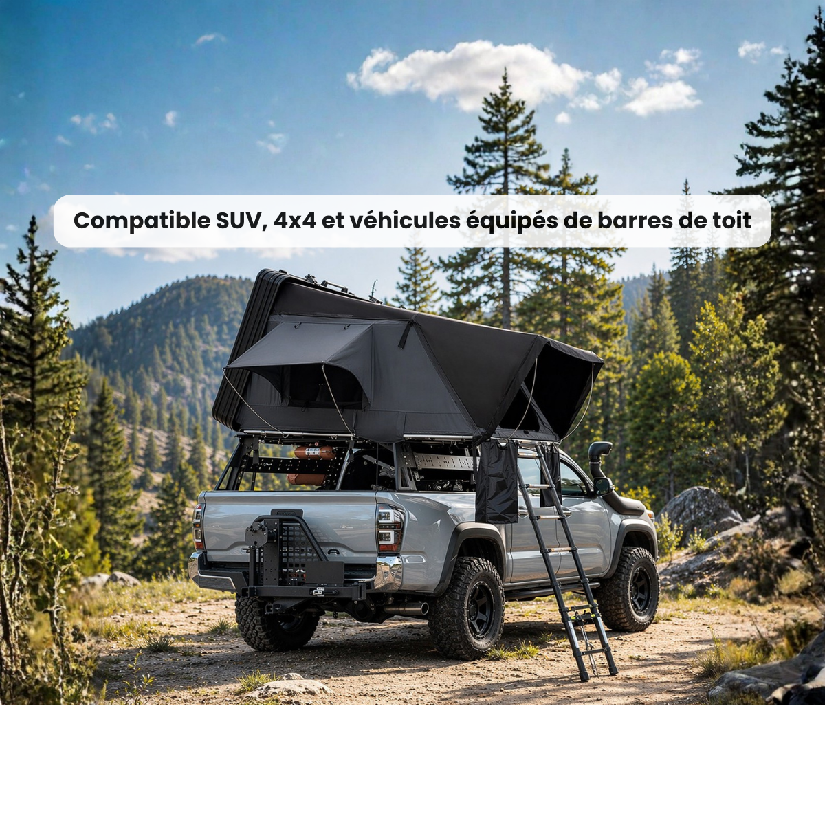 Cette tente de toit permet de créer un espace de couchage directement sur votre véhicule, avec une capacité de 2 adultes et 1 à 2 enfants. Elle est compatible avec les SUV, vans, 4x4 et pick-up équipés de barres de toit supportant au minimum 270 kg.